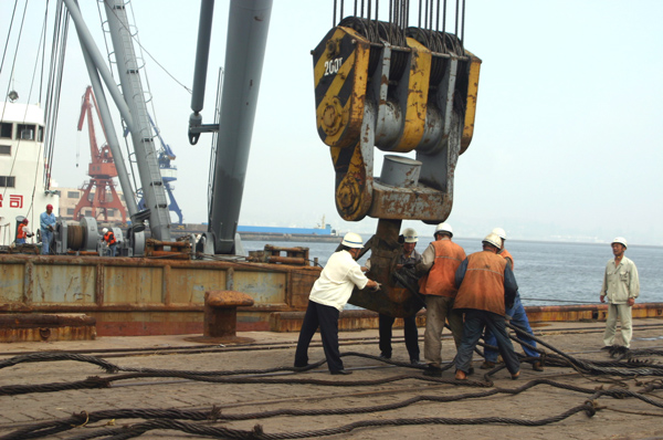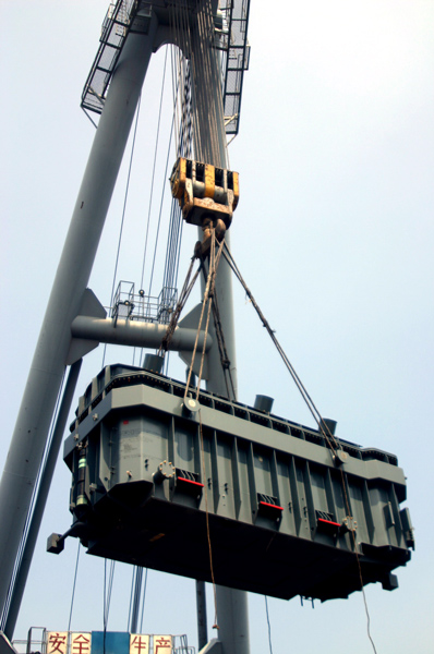 由于門機(jī)不能起吊這樣的大型設(shè)備,所以有關(guān)部門聯(lián)系到海吊,進(jìn)行裝船作業(yè)。不要以為海吊來了就萬事大吉了,往這個(gè)負(fù)荷200T的大鉤頭上掛鋼絲繩就十分麻煩。