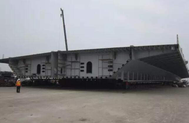 力特公司中標(biāo)港珠澳橋梁工程CB02合同段內(nèi)15.1萬(wàn)噸,包括58件非通航孔橋、江海直達(dá)航道橋鋼箱梁和3件鋼索塔的運(yùn)輸。此前,該公司已順利完成56件大節(jié)段和2件鋼索塔的滾裝運(yùn)輸,其中最重的達(dá)3000噸,而本次滾裝的L22-1鋼構(gòu)大節(jié)段是港珠澳大橋CB02標(biāo)段最后兩件航道橋大節(jié)段中的一件,外形尺寸為128米×38.8米×4.5米,重3500噸,是該標(biāo)段有史以來最寬、最重的橋梁主體鋼構(gòu)大節(jié)段。