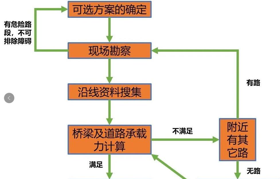 (2)現(xiàn)場對可行線路方案沿線進(jìn)行踏物并調(diào)整方案,以避開存在損壞較嚴(yán)重的橋梁、承載力不足且跨徑較大的大橋或存在路基不穩(wěn)等情況的危險路段;統(tǒng)計運輸過程中可能遇到的障得,勘測設(shè)計通過或避開障得的方法,如有不可排除的障礙或排除障礙費用過高則應(yīng)調(diào)整運輸方案避開此障礙。